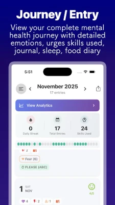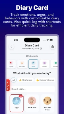 Με το DBT Coach, η παρακολούθηση της προόδου σας είναι απλή και οπτικοποιημένη. Η διαισθητική κάρτα ημερολογίου σάς επιτρέπει να καταγράφετε με ακρίβεια τις συναισθηματικές σας καταστάσεις και την εφαρμογή δεξιοτήτων, προσφέροντας προηγμένες αναλύσεις που αποκαλύπτουν μοτίβα και τάσεις. Μοιραστείτε αβίαστα την πορεία σας με τον θεραπευτή σας μέσω της ενσωματωμένης πλατφόρμας, εξαλείφοντας την ανάγκη για εβδομαδιαία emails. Η εφαρμογή περιλαμβάνει επίσης ένα «Εργαλειοφόρο Επιβίωσης Κρίσης» για άμεση πρόσβαση σε δεξιότητες αντοχής στη δυσφορία, καθώς και ένα σύστημα κινήτρων που σας επιβραβεύει για τη συνέπεια και τα επιτεύγματά σας. Ο κομψός σχεδιασμός της, με δυνατότητα προσαρμογής και σκοτεινή λειτουργία, εξασφαλίζει μια ευχάριστη εμπειρία χρήσης, ενισχύοντας την πορεία σας προς την ευεξία.