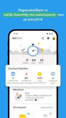 Το QuitNow σας επιτρέπει να παρακολουθείτε την απίστευτη πρόοδό σας σε πραγματικό χρόνο, μετατρέποντας τους στόχους σας σε ορατές νίκες. Στην κεντρική οθόνη, θα βλέπετε πόσος ακριβώς χρόνος έχει περάσει από το τελευταίο σας τσιγάρο, πόσα τσιγάρα αποφύγατε, πόσα χρήματα εξοικονομήσατε και πόση επιπλέον ζωή κερδίσατε. Επιπλέον, γνωρίζοντας τη σημασία της υποστήριξης, το QuitNow φιλοξενεί μια ζωντανή κοινότητα. Ένα chat γεμάτο με άτομα που μοιράζονται την ίδια εμπειρία απεξάρτησης, προσφέροντας ένα ασφαλές περιβάλλον για να μοιραστείτε σκέψεις, προκλήσεις και επιτυχίες, κάνοντας το ταξίδι σας λιγότερο μοναχικό.