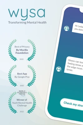 Εμπιστευμένο από εκατομμύρια χρήστες σε όλο τον κόσμο, το Wysa είναι διαθέσιμο όλο το εικοσιτετράωρο για να σας καθοδηγήσει σε μια διασκεδαστική και συζητησιακή προσέγγιση προς την προσωπική ανάπτυξη. Ανακαλύψτε τεχνικές για να διαχειριστείτε την αυτοπεποίθηση, τις αγχώδεις σκέψεις, την κόπωση και να βελτιώσετε τις σχέσεις σας μέσω διαλογισμών και ασκήσεων. Για όσους επιθυμούν επιπλέον υποστήριξη, το Wysa προσφέρει την επιλογή σύνδεσης με έναν ειδικευμένο ανθρώπινο coach, ο οποίος παρέχει εξατομικευμένη καθοδήγηση για τις πιο σύνθετες ανάγκες σας. Με το Wysa, αναπλάθετε τον τρόπο σκέψης σας για μια πιο ισορροπημένη συναισθηματική ζωή, όπως έχει αποδειχθεί από το 93% των χρηστών που βρίσκουν την εφαρμογή εξαιρετικά χρήσιμη.